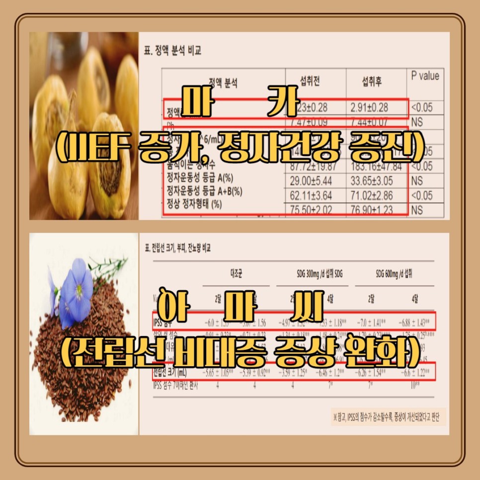 3. 마카 앞에서 말한 마카도 만수미칼의 원료입니다. 마카를 섭취한 대상자들은 IIEF점수가 증가하고 정액량, 정자수, 정자운동성이 모두 유의미하게 증가하여 정자건강에 좋은 효과를 보이는 것으로 나타나 효과를 증명하였습니다.