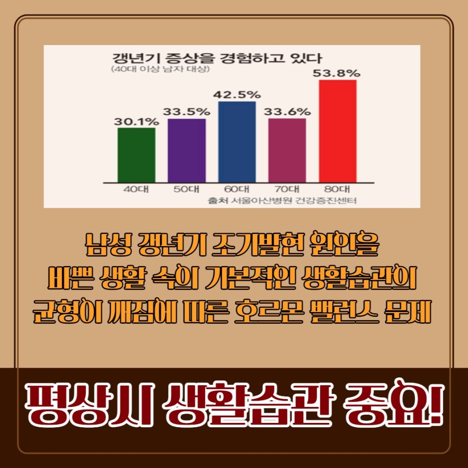 실제로대학병원에서조사한남성갱년기발현시기를보면40대에이미남성갱년기를경험한사람이30%이상으로굉장히높은비율로나타난대요.전문가들은 이 같은 갱년기의 조기 발현 원인을 바쁜 생활 속 기본적인 생활습관 균형이 깨짐에 따른 호르몬 균형 문제로 보고 평소의 기본적인 생활습관을 유지할수록 이런 건강문제에서 벗어날 수 있다고 말합니다.