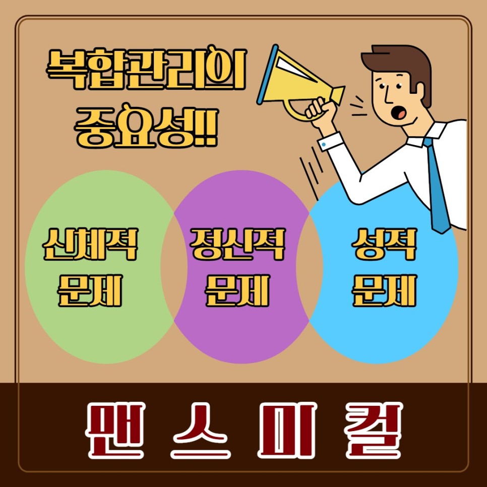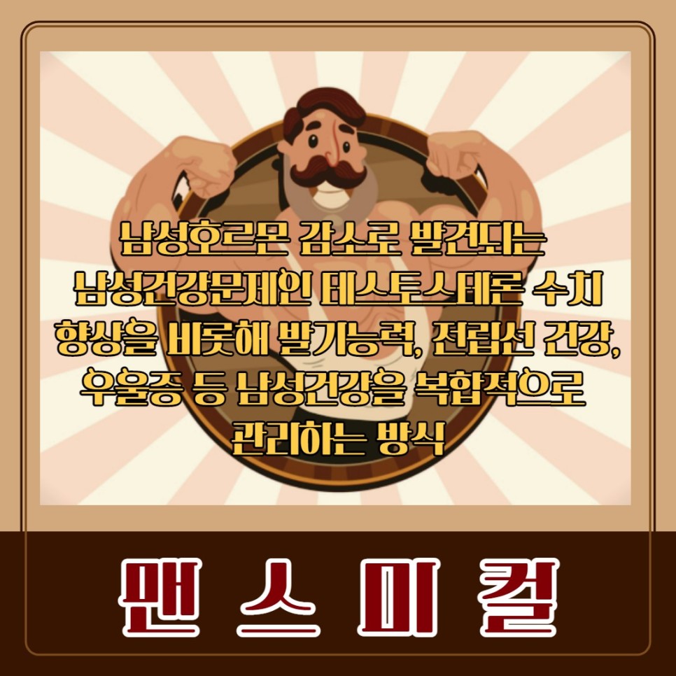 만수미칼은 남성 호르몬 감소로 발견되는 남성 건강 문제인 테스토스테론 수치 향상을 비롯해 발의 기능력, 전립선 건강, 우울증 등 남성 건강을 복합적으로 관리하는 방법입니다.