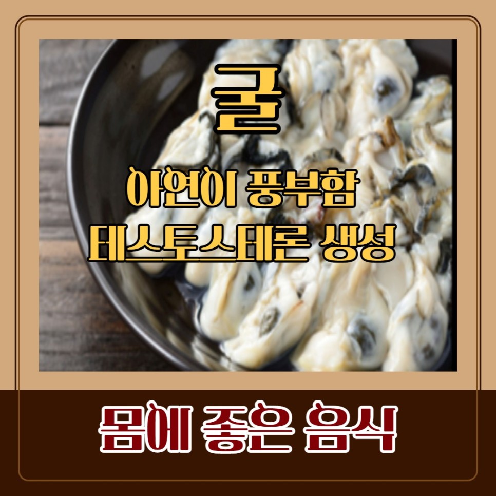 - 굴굴이 가지는 아연 성분은 신체 내에서 남성 호르몬인 테스토스테론의 생성에 긍정적인 영향을 준다고 합니다.따라서 굴을 자주 섭취하시면 남성호르몬의 급격한 감소를 감소시키는 효과가 있을 것입니다.