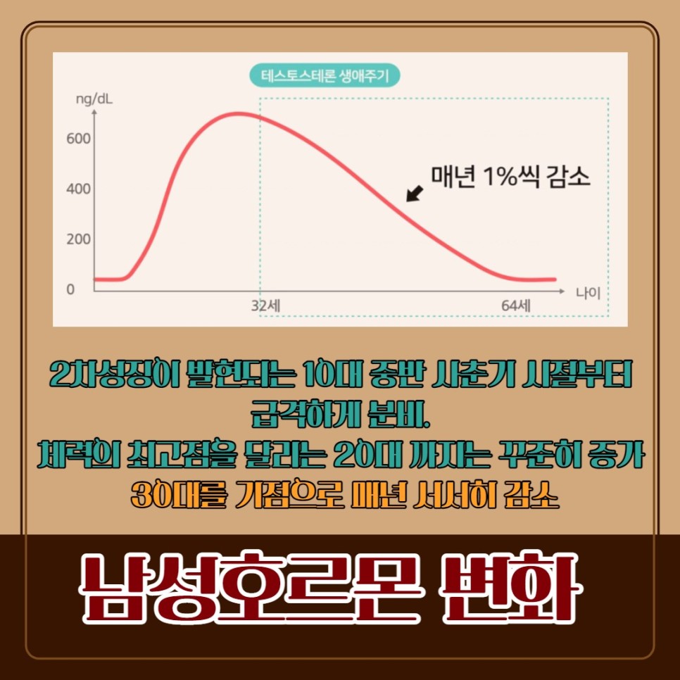 성호르몬인 남성호르몬은 2차성징이 발현되는 10대 중반의 사춘기부터 급격히 분비됩니다. 그리고 체력의 최고점을 달리는 20대까지는 꾸준히 증가하지만 30대를 기점으로 매년 서서히 감소하는 것이 일반적인 남성 호르몬의 변화입니다.