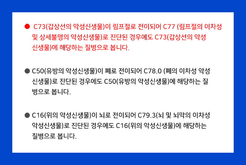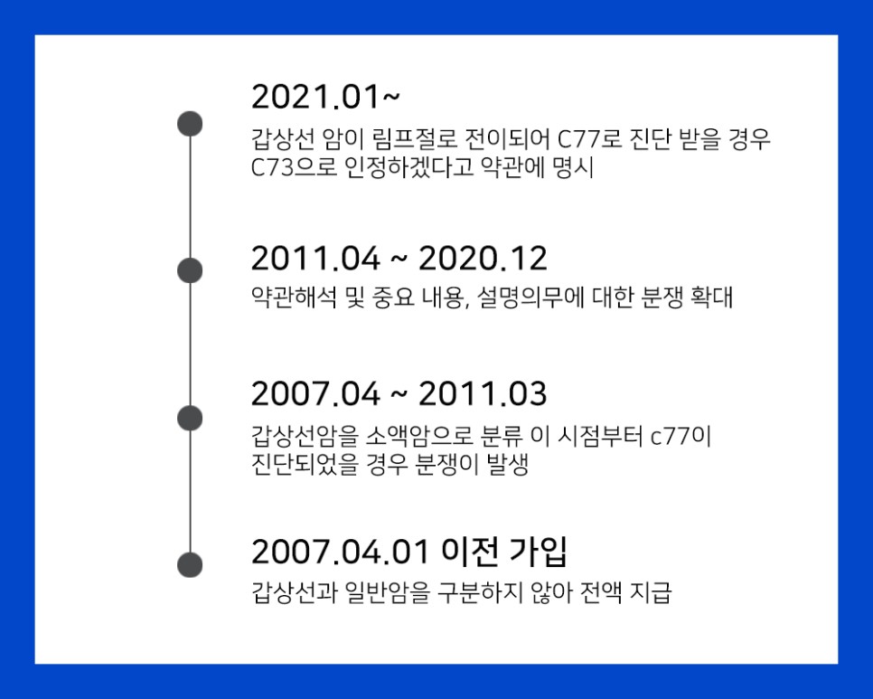이 질환의 분쟁에 대해 가장 쟁점으로 생각해 두고 싶은 부분은 설명 의무입니다.보험 가입 시 림프절 전이암(c77)이 진단되어도 갑상선암으로만 보상받고 있음을 설명해 주었는지, 입증 가능한지에 따라 보상 여부가 달라질 수 있습니다.