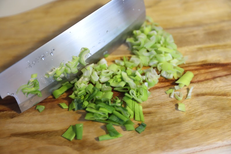 일단 볶음을 할 때 가장 기본이 되는 파를 다졌어요.칼집이 좋아서 그런지 파 껍질이 굳어지지 않고 곱게 다져서 마음에 들어요.
