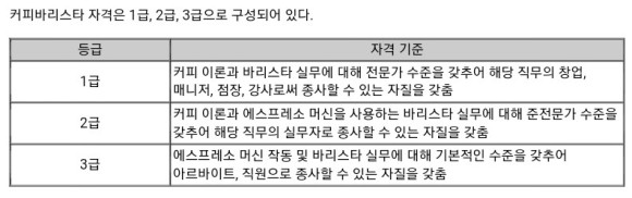- – 3급 : 에스프레소 머신 작동 및 바리스타 실무에 대해 기본적인 수준을 갖추고 아르바이트, 직원으로 종사할 수 있는 자질을 갖추다.