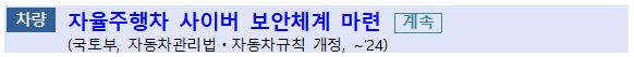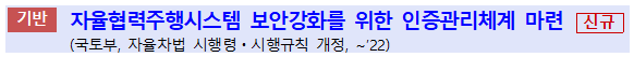 - ▪(개선) ‘자율차법’ 개정(‘21.7.27)을 통해 인증서를 발급받은 차량, 인프라만이 통신할 수 있는 인증관리시스템 세부기준 수립·운영