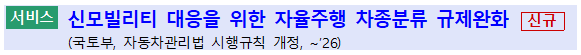 ▪(현행)기존의 차량형태에서 꽃게 개발되고 있는 다양한 종류의 자율주행 모빌리티(소형무인배송차, PBV(목적기반차량, 여객, 화물병용))는 자동차관리법상 차종분류체계에 적합하지 않아 양산 및 상용화가 불가능함