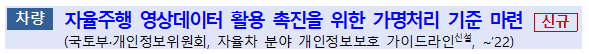 ▪(현행) 개인정보를 가명처리할 경우 정보주체 동의 없이도 연구 등에 활용할 수 있으나 자율차 영상분야에 대한 세부기준이 부족하여 실제 처리 및 활용에 어려움이 있음.