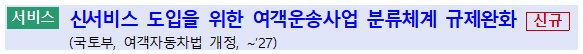 - ▪(개선)자율주행차를 활용하여 실현 가능한 다양한 모빌리티 서비스를 포함할 수 있도록 여객운송사업 분류체계 및 운영 관련 규정 개선