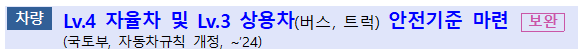 ▪(개선) Lv.4 시스템(결함시 대응 등), 주행(좌석배치별 충돌안전성 등), 운전자(윤리 등)에 대한 규정 마련 및 승합 및 화물차용 Lv.3 안전기준 마련