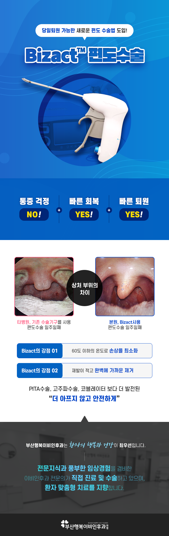 편도 수술, 환자에게 맞는 수술을 해야 효과적.편도 수술은 절제술, pita, 고주파, bizact 수술 방법으로 다양하며, 환자마다 맞는 수술 방법을 고려할 수 있다. 이 중 bizact 수술방법은 통증 걱정을 덜어주며 회복이 빠르고 퇴원이 빠르다.60도 이하의 온도에서 조직 손상을 최소화하고 재발이 적어 거의 완벽하게 제거할 수 있다는 장점이 있다. 보다 아프지 않은 효과적인 치료 방법으로 환자의 부담감이 적어 좋은 결과를 얻을 수 있다. 이러한 수술은 임상 경험이 풍부한 이비인후과 전문의에게 진단 및 치료를 받아야 한다. 부산행복이비인후과는 편도치료에 다양한 수술방법이 있으며 임상경험이 풍부한 이비인후과 전문의가 직접 진료하고 있다.