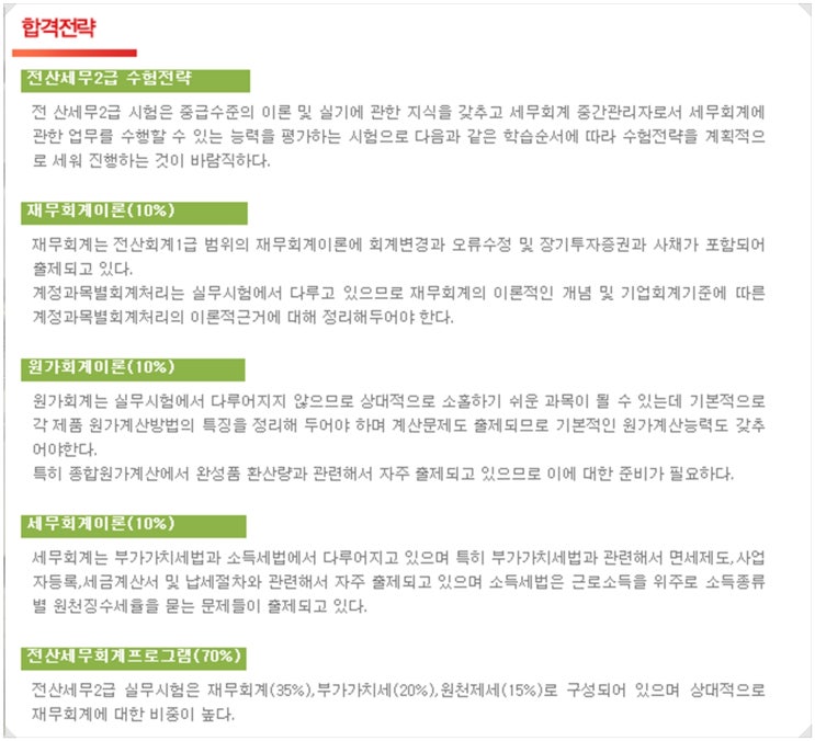 試験資格制限はないので、誰でも受験できますので、電算税務2級を受けたい方は誰でも受けることができます。私が受ける試験が何かも知らずに受ける礼儀ではないでしょう?まず、試験は<理論、実務>の2つに分けられます。<理論>は私たちが知っている筆記試験と同じで、<実務>はコンピュータプログラムを活用した実技試験で問題を解くことになります。90分間行われる試験で70点以上(100点満点)を越えないと合格できません。カットラインが思ったより高くない方なので、難易度は中程度だと思ってください。色んな資格証を見ると、これより高いものもあれば低いものもありますからね。電算会計/電算税務1位のエデュウィル::エデュウィル電算税務会計韓国税理士会資格試験、電算会計、電算税務300%払い戻しパス受講申請! ベストセラー1位著者直講!、電算会計1級、電算会計2級、電算税務2級、電算税務会計資格試験、2022大韓民国ブランド満足度電算税務会計教育1位エデュウィル、2022大韓民国ブランド満足度税務会計教育1位エデュウィル、電算税務1級、電算税務会計無料オンライン講義、300%払い戻し、ベストセラー1位教材、韓国税理士会資格試験、理論講義、実務講義、電算会計独学、電算税務独学、電算税務会計教育1位エデュウィル、2022大韓民国ブランド満足度税務会計教育1位エデュウィル、電算税務会計無料オンライン税理士資格証、韓国税理士資格証、税務試験電算税務2級は、<財務会計>、<原価会計>、<税務会計>(以下理論、各10%ずつ/ 4肢選択多型客観式)、<原価会計>、<付加価値税>、<源泉税制>、(以下実務、各35、20、15%/KcLepプログラム活用)科目で構成されています。「30%」と「70%」の割合に分かれています。項目別に比率を告知していて、情報もある程度提供されている状態なので、勉強しながらどう見るか計画を立てるのも一つの方法です。何の準備もなく見に行くと慌てて急に髪が白くなって進展がないんですよ。エ、デュ、ウィル教材の中にあるカリキュラムが整っていて、常に最新にアップデートされるという点が良かったです。また、購入後にインターネット講義を通じて講義を聞けばいいので、利便性も備わっていました。最新の税法が適用されており、最新の既出分析で効率的な学習が可能になり、KcLepも事前に学んで慣れることができました。きめ細かなカリキュラムは計画的に学習しやすいのですが。電算税務2級の必要性は今後の展望を見ればある程度ユーチューブが可能です。税務会計関連の採用はどんどん増えていて、現在も<1位>だそうです。ここに採用優待、加算点、単位銀行制まで認めてくれることを考えると明るいと言えます。メリットが確実なので、あらかじめ準備した方が賢明ではないでしょうか?助けを受けながら取得することで、私が望む職場に自信を持って挑戦してみようと思います!試験受験資格及び合格点理論、実務試験科目及び比重[上記のポスティングはエデュウィルから手数料を 支給してもらって作成されました]未来展望とメリット<水、木>既出問題を解いた後、間違ったことがあればある程度理解しておき、翌日<金>要約および整理(誤答ノート)を作成しました。特に誤答ノートを書く時は単純に書くことで終わるのではなく変形させてみたりもしました。以前、私が学校に通っていた時に塾でやってくださった方法です。誤答ノートというのは変形に弱い距離、こうしないと役に立たないのと同じだそうです。