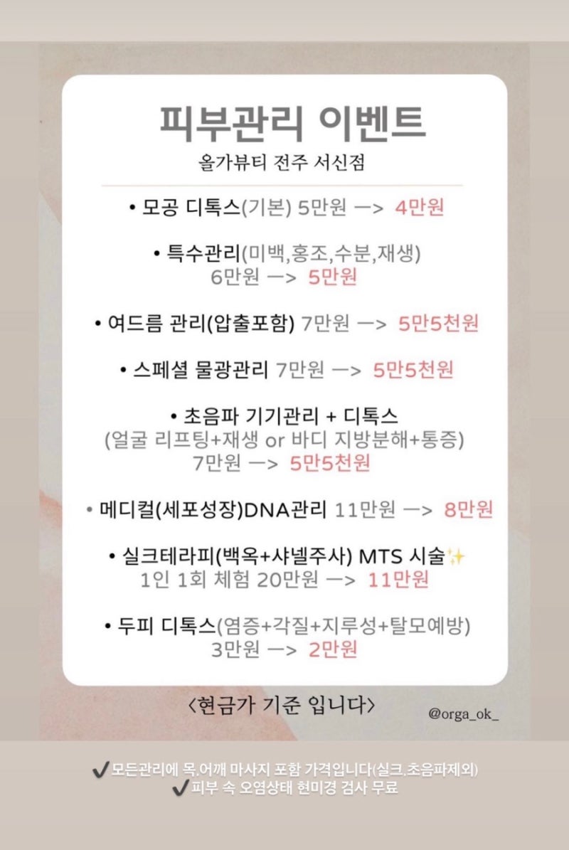 #전주피부관리실 #서신동피부관리실 #여드름케어 #흉부관리 #광택케어 #초음파관리 #모공케어 #올가드림뷰티 #서신동