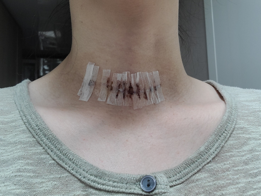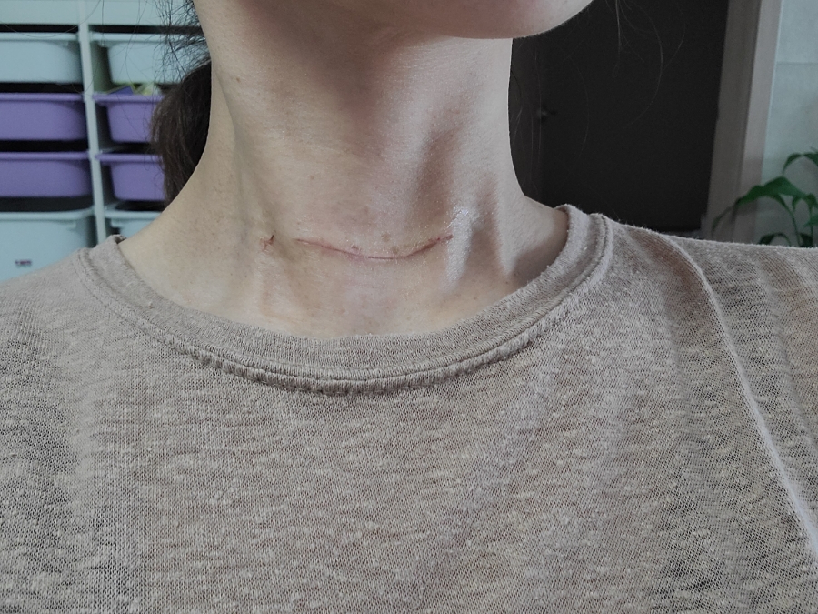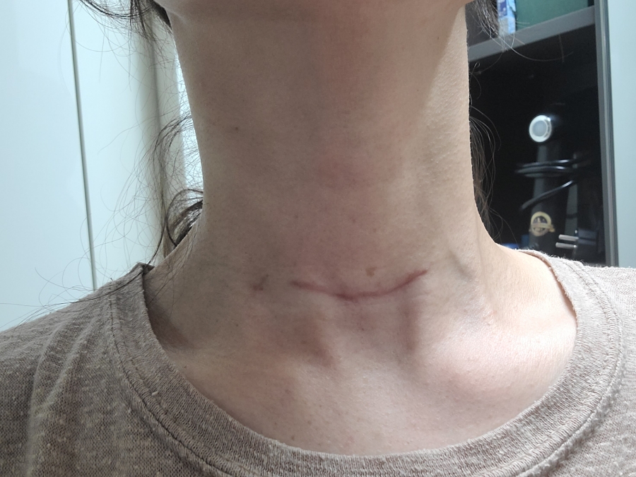 생각을 너무 많이 하면 스트레스가 쌓이니까 한동안 흉터 신경 안 쓰려고 했는데 시간이 지나면서 목의 흉터도 얇아졌어요22.1월에 찍은 사진인데 전보다 많이 옅어진 느낌이 들지 않나요?~바이더 닥터를 다 쓰고 난 후, 흉터 관리라고는 스카픽스 정도 밖에 하지 않았습니다.
