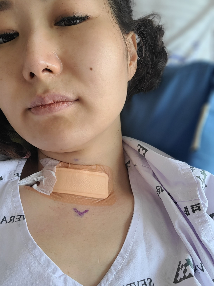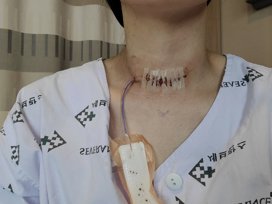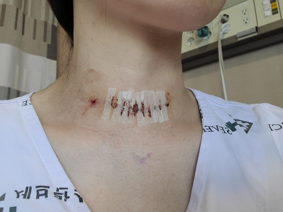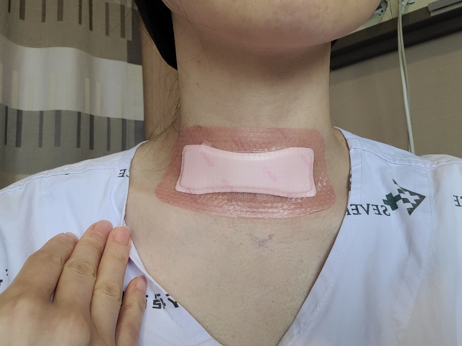 갑상선 절제술 하러 가기 전과 직후의 모습입니다수술후 목은 뒤로 젖히면 절대 안된다고 합니다.하루가 지난 후 천천히 목운동을 할 수 있는데 그때도 뒤로 젖히기보다 고개를 숙이고 왼쪽과 오른쪽을 기울이는 정도, 팔을 위아래로 움직이는 정도로 가볍게 시행합니다.