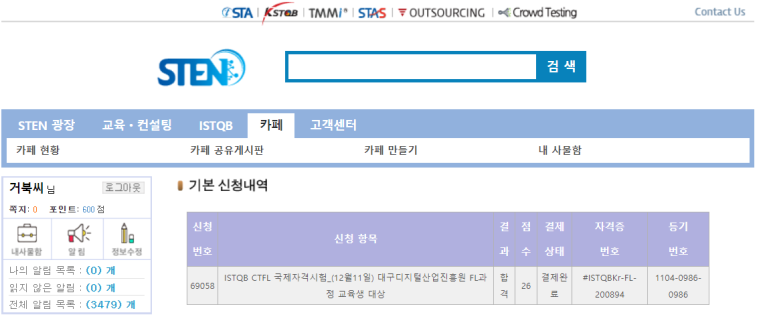합격을 확인한 후 실시해야 할 일은 회원정보 확인 및 수정이다. 상장 형태의 종이로 발급되는 IST QB 자격증은 이유를 알 수 없지만 재발급이 어렵다는 설명을 시험감독관에게 들을 수 있었다. 그래서 자격증이 배송되는 주소와 영문 이름을 잘 확인해야 하는데, 이들 정보를 회원가입 시 입력한 STEN 회원정보를 기반으로 쓰이고 자격증 제작에도 사용되므로 합격했다면 다시 한번 정보를 확인해야 한다.