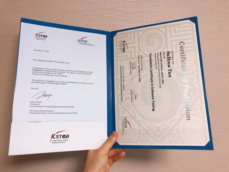 SW 테스팅 자격증은 조금 딱딱하고 매끄러운 종이로 만들어졌다. 안을 펼쳐보면 수많은 검색에서 이미 알고 있던 자격증의 모습과 같은 갈색 자격증이 있고, 다른 한쪽에는 대충 축하한다는 내용이 담긴 A4용지가 하나 끼어 있다.