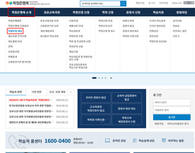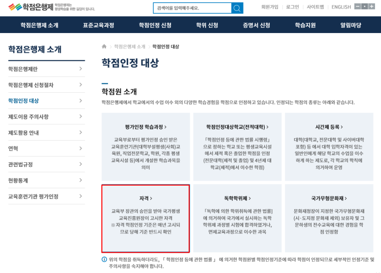 들어가서 학점은행제 소개 ->학점인정 대상을 클릭하세요!