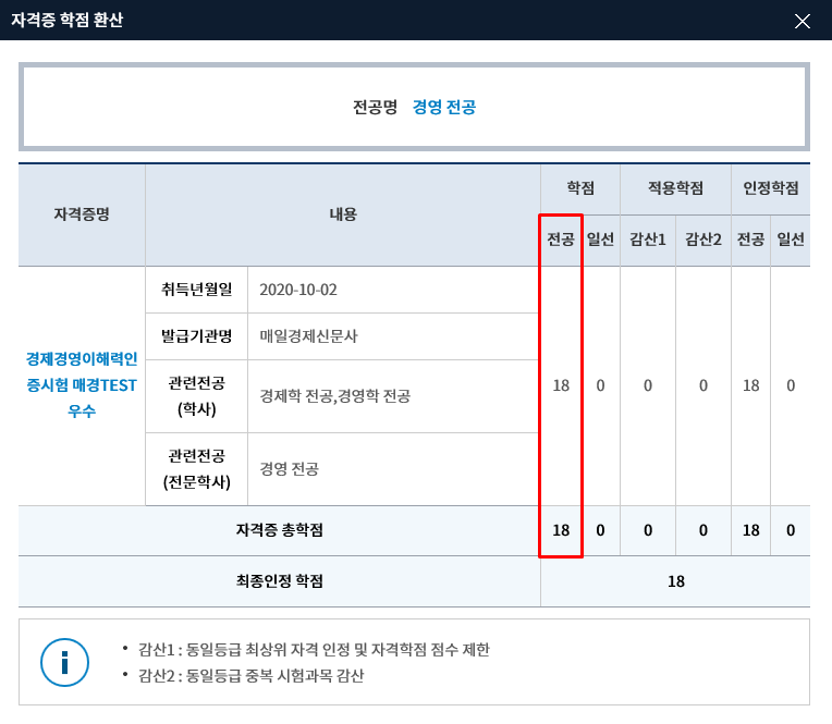 이처럼 매경 시험 우수 등급은 경영 전공에서 18학점이나 인정된다는 것을 확인할 수 있습니다!