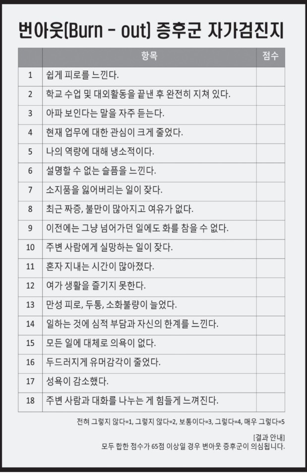 번아웃 증후군을 테스트하는 방법은 솔직히 많은 것 같아어떤 글에서는 스트레스 자가진단을 이용하기도 하고 어떤 글에서는 다섯 가지 질문이 나오기도 합니다.
