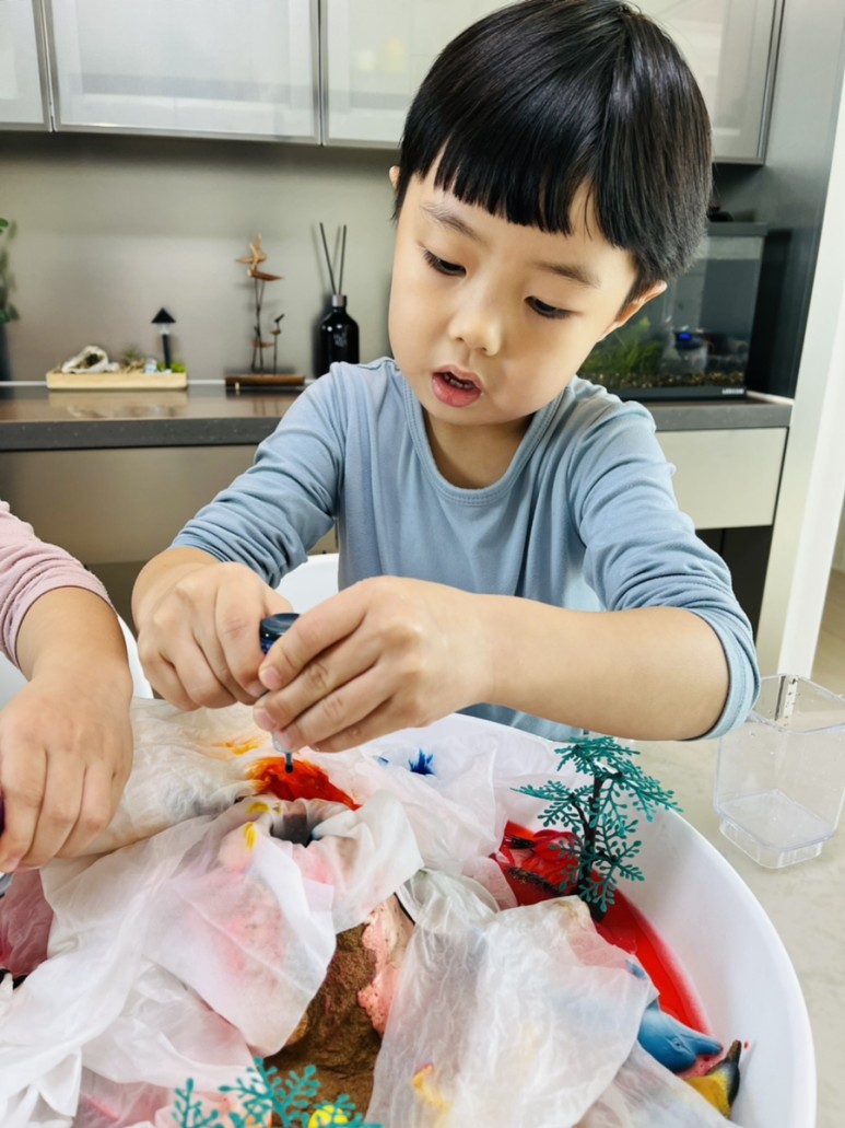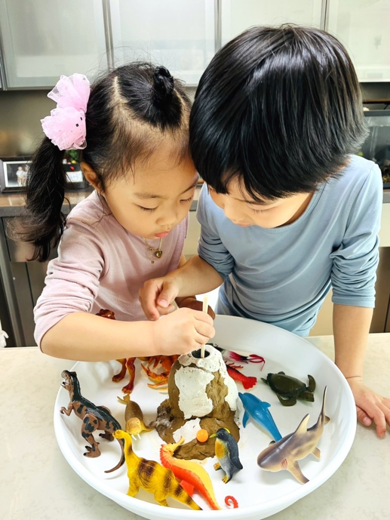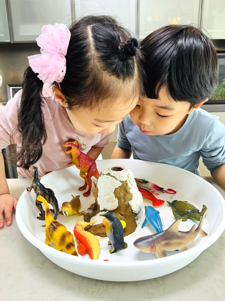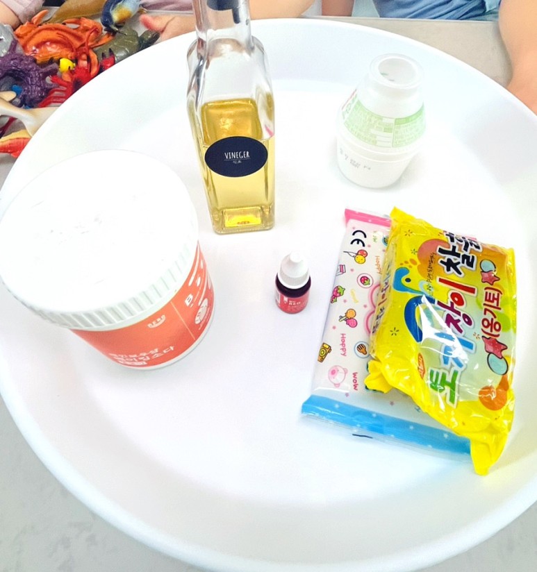 - 점토로 우유 상자를 싸고 산을 만든다 2. 점토산 속에 소다+적색소+주방세제를 넣고 섞는다 3. 식초를 붓는다(주방세제는 화산이 천천히 길게 부풀어 오르게 하는 역할을 한다) 자!!! 사진투척