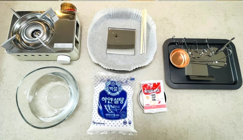 - 국자에 설탕을 넣고 녹인다2. 베이킹소다를 묻혀 넣는다(설탕10:소다1)3. 붓고 30초가 지나면 모양을 만든다.
