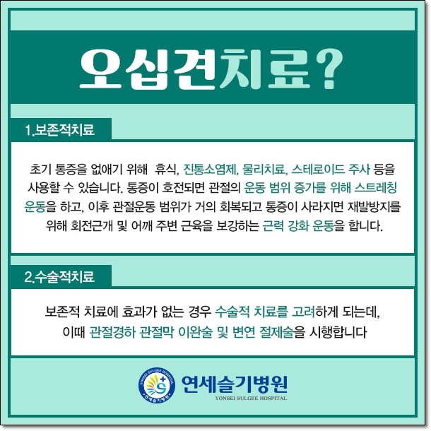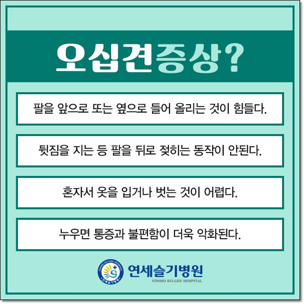 따라서 증상이 나타나면 돌봄을 미루지 말고 내원해서 이에 대한 정확한 진단을 받아보고 오십견에 좋은 체조를 더해보는 것도 필요하다고 할 수 있습니다.