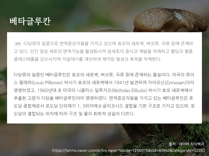 ※ 상기 내용은, 전문 의학적 암 예방에 대한 효능 효과가 아니라, 버섯 자체가 가지는 성분의 효능에 대해 기재하고 있습니다.