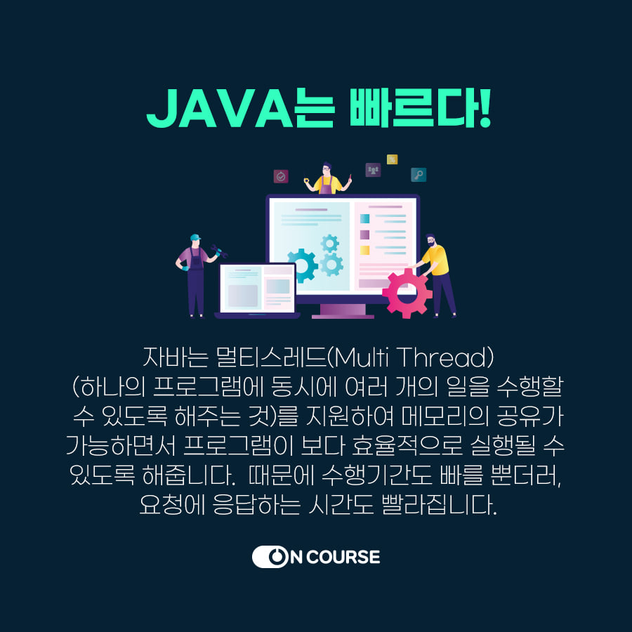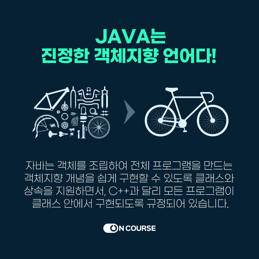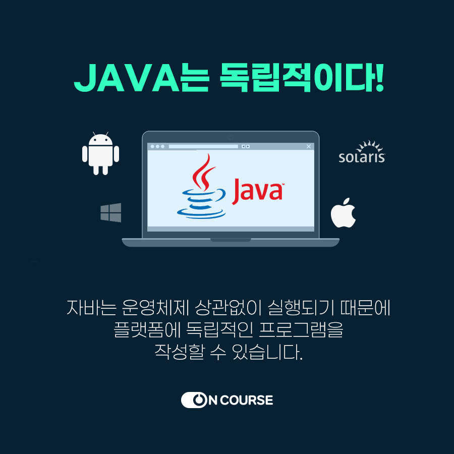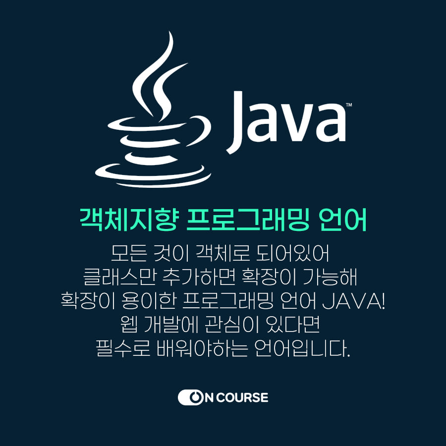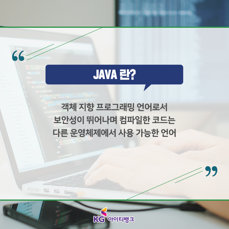 java는 대표적인 객체 지향언어로 C언어나 C++에 비해 간략하고 용이하며 네트워크 기능을 구현하기 쉬워 인터넷 환경에서 가장 활발하게 사용되는 언어입니다.