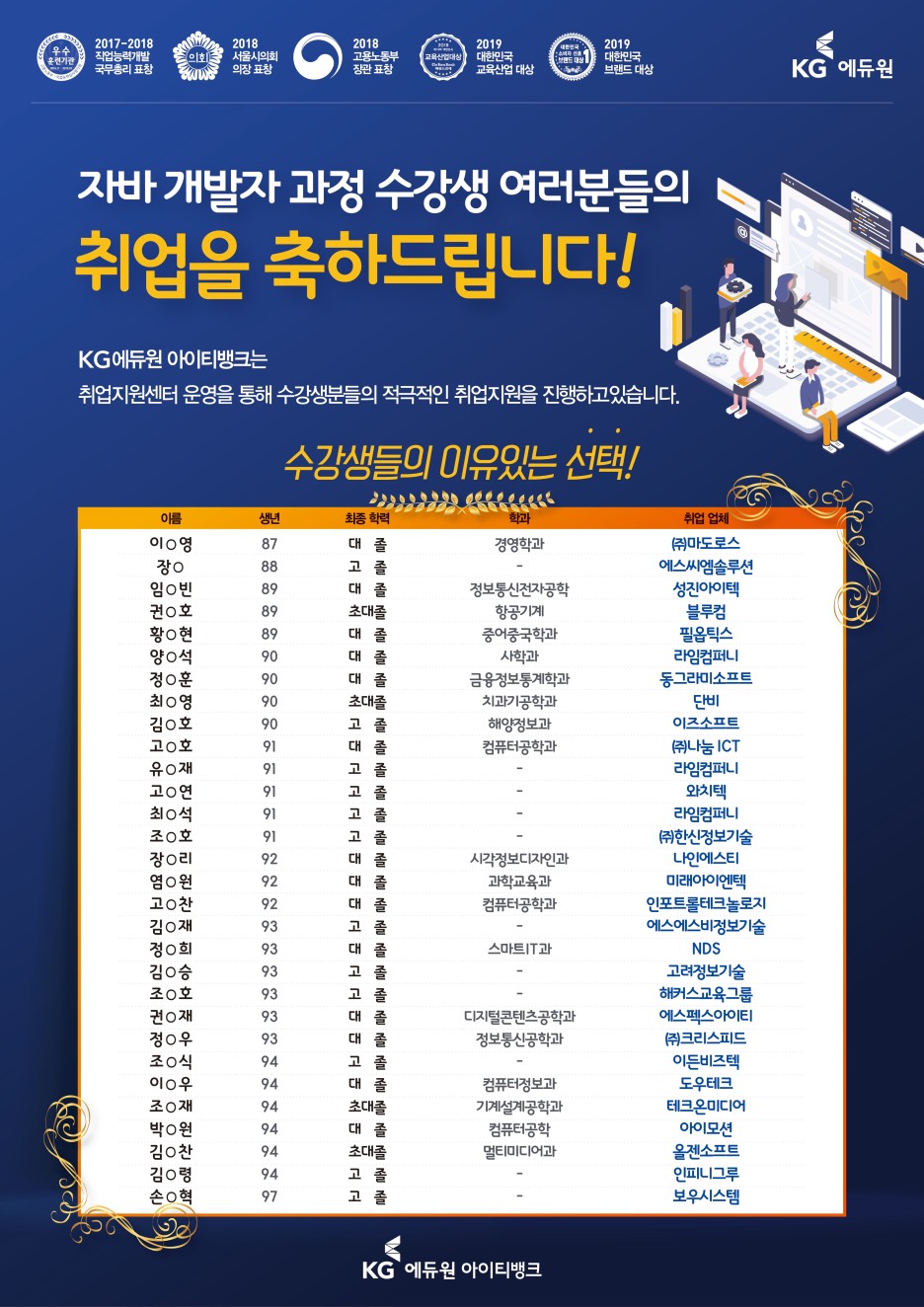 자바학원의 KG아이티뱅크에서는 개발자 취업을 꿈꾸는 전공자부터 비전공자, 고졸자부터,