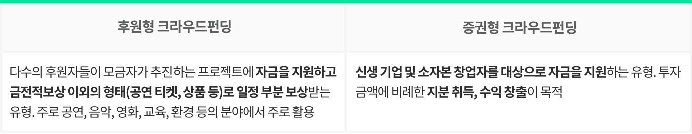크라우드펀딩(영어: crowd funding)은 소셜네트워크서비스를 이용해 소규모 후원을 받거나 투자 등의 목적으로 인터넷과 같은 플랫폼을 통해 다수의 개인으로부터 자금을 모으는 행위다. 소셜펀딩이라고도 하지만 정확한 용어는 아니다. 주로 자선활동, 이벤트 개최, 상품개발 등을 목적으로 자금을 모집한다. 투자방식 및 목적에 따라 지분투자, 대출, 보상, 후원 등으로 분류할 수 있다. 후원형 크라우드펀딩은 후원자가 문화창작활동, 사회공익활동 등을 후원한 후 비금전적 보상, 즉 공연티켓 등을 받거나 기여자 명단에 이름을 올리는 방식으로 리워드(보상)를 받는 형태입니다. 후원을 받고자 하는 단체나 개인은 크라우드펀딩 서비스를 통해 프로젝트나 모금함을 개설하여 크라우드펀딩을 진행하게 되는데, 목표한 후원금액이 100% 이상 달성되어야 후원금액을 받을 수 있는 ‘Allor Nothing’ 방식과 100% 달성되지 않더라도 모인 후원금액을 수령하여 프로젝트를 진행할 수 있는 ‘Keep It All’ 방식 두 가지가 있습니다.존재하지 않는 이미지입니다.해피빈 사이트 바로가기 서류상 1년 이상 비영리 민간단체 등록증이나 사업증을 갖고 있는 단체라면 모금함 개설이 가능하며 ‘해피로그’를 통해 단체 후원을 직접 받을 수 있다. 해피빈의 또 다른 서비스인 ‘공감펀딩’은 사회문제 해결을 위한 활동, 공익적 창작활동, 소셜벤처 등 공익적 의미가 있는 일이라면 단체, 개인 누구나 펀딩을 받을 수 있다. Allor Nothing, Keep It All 두 가지 방식을 모두 취한다.*수수료 규정: 별도의 수수료 없이 가치 사이트 바로가기, 올해 새롭게 시작한 함께가치는 카카오의 사회공헌 플랫폼으로 누구나 공익 프로젝트 수행을 위한 모금함을 개설해 직접 모금받을 수 있다. 또 개인은 기념일에 모금함을 통해 원하는 기부처에 기부금을 전달할 수 있다. 함께 가치는 모금과 기부를 연계할 뿐 아니라 모금 콘텐츠 댓글, 공유 수에 따라 매칭 방식으로 카카오가 직접 후원에 참여한다.*수수료 규정: 별도의 수수료 없는 스토리펀딩 사이트 바로가기 스토리펀딩은 기존 다음 뉴스펀딩을 개편한 모금 플랫폼으로 저널리즘, 라이프, 캠페인, 스타트업, 아트, 출판의 6개 주제에 해당하며 공공의 가치를 훼손하지 않는 프로젝트라면 누구나 신청이 가능하다(단순 기부는 불가). 사진, 동영상, 오디오 등을 쉽게 편집할 수 있는 에디팅 툴과 후원자 통계와 리워드 관리 서비스를 제공한다.*수수료 규정: 프로젝트의 성패와 상관없이 5%+플랫폼 수수료 10%(VAT 별도) 오마이컴퍼니 사이트 바로가기 세상을 혁신하고 가치나눔을 위해 일하고 있는 스타트업, 소셜벤처, 사회적기업, 협동조합, 소상공인과 단체의 자금조달을 지원하기 위한 플랫폼이다. 최근 투자형 크라우드펀딩 서비스도 출시해 모금형과 투자형을 함께 운영하고 있다.고용노동부와 함께 국내 최대 규모의 ‘사회적기업 크라우드펀딩 대회’를 매년 개최하고 있다.*수수료 규정: 최종 모금액의 7%(VAT별)와 디즈니 사이트 숏컷 와디즈는 후원형 크라우드펀딩으로 출발했지만 법안 통과 후 투자형 크라우드펀딩도 함께 하고 있다. 공익 관련 프로젝트가 아니더라도 프로젝트를 등록할 수 있다. 와디즈는 행정자치부와 함께 공공성과 성공 가능성이 높은 프로젝트를 선정, 펀딩을 연계하는 지역사랑 크라우드펀딩 대회를 개최했으며 최근에는 지상파 예능방송을 통해 ‘크라우드펀딩쇼’를 진행하고 있다.*수수료 규정: Allor Nothing: 고정수수료는 7%(VAT별도), Keep It All: 성공시 10%(VAT별도) 소셜펀치 사이트 바로가기 2011년 말 진보네트워크가 시작한 ‘소셜펀치’는 사회운동을 지원하는 시민 누구나 참여할 수 있는 온라인 후원 플랫폼이다. 취약계층에 대한 자선사업보다는 사회변화를 위한 투쟁, 캠페인, 프로젝트 지원에 초점을 맞추고 있다. (예: 기업, 국가폭력에 대항하는 사람들을 돕기 위한 기금모집, 부조리한 현실법 제도 및 정책을 비판하거나 대안정책을 마련하기 위한 사업, 사회운동을 위한 인프라 구축 및 인권, 시민사회단체 지원사업, 대안적 문화창작, 유통 및 연구프로젝트, 기타 사회진보, 민주화, 인권보호를 위한 사업) * 수수료규정: 최종 모금액의 3%(VAT별) 비카인드 사이트 바로가기 비카인드는 국내 자선모금(타인에게 기부의 의미를 알리고 참여를 유도하는 활동으로 단순 기부행위보다 적극적이고 적극적으로 확산시킨다.) 후원자는 비카인드에서 공약을 내걸고 자신만의 모금함(자선모금함)을 개설하거나 생일을 맞아 지인에게 선물 대신 기부를 해달라고 요청하는 생일모금함을 개설할 수 있다. * 수수료 규정 : 수수료 없음. 모든 모금액이 각 단체에 직접 전달되는 펀루사이트 숏컷펀루는 모금 캠페인, 착한소비 캠페인 등 크라우드펀딩뿐만 아니라 비영리단체 지원 정보를 업데이트하고 모금 플랫폼 홈페이지 제작과 운영을 지원하는 등 공익활동 관련 다양한 지원사업을 펼치고 있다.*수수료 규정: 후원자 수에 따라 수수료가 다름(후원캠페인의 경우 1~50명은 10%, 51~100명은 9%, 101~150명은 8%, 151~200명은 7%, 201~300명은 6%, 301~399명은 5%, 400명 이상은 4%) 텀블벅 사이트 바로가기 대