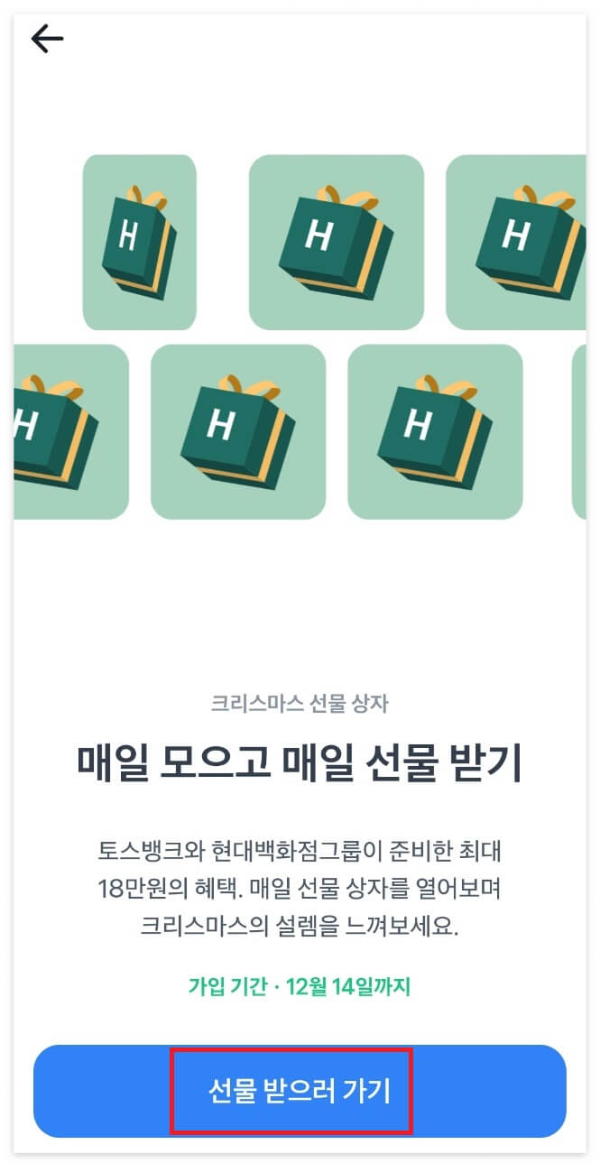 토스뱅크와 현대백화점그룹의 콜라보 이벤트입니다. 토스뱅크에는 ‘모으기’라는 기능이 있는데, 돈을 모으는 용도를 설정하고 토스뱅크에 있는 돈의 일부를 ‘모으기’에 저축하도록 모을 수 있습니다. 새로운 계좌가 만들어지는 것이 아니라 토스뱅크에 저축된 돈을 수치적으로만 구분할 수 있도록 해놓은 기능이기 때문에 같은 2.3%의 이자를 받는다고 합니다. 이 기능을 크리스마스 이벤트에 연결하여 매일 1,000원 이상의 금액을 ‘크리스마스 기프트 박스’라는 모음에 넣으면 상품을 받을 수 있는 이벤트입니다.