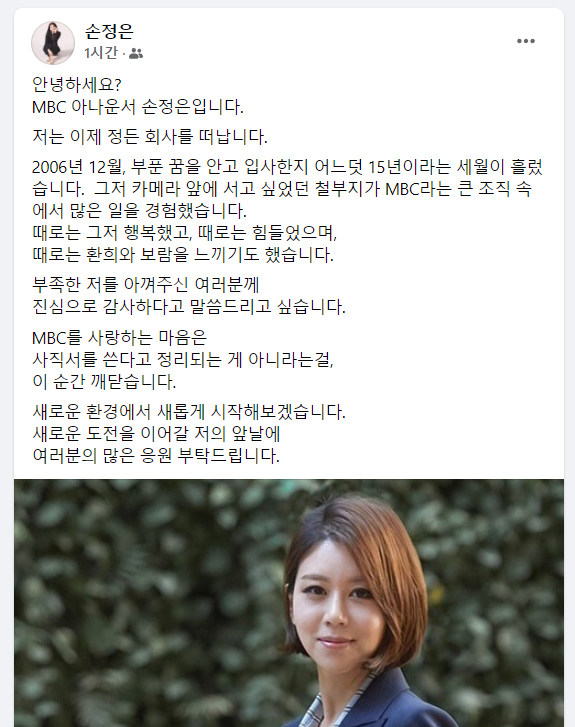 아나운서 손정은도 자신의 페이스북에 퇴근 소식을 알렸습니다. 아나운서 손정은은 「새로운 환경에서 새롭게 도전해 보고 싶은 기분이 들었다, 향후 무엇을 할지는 구체적으로 정해져 있지 않다. 여러 방면으로 고민해 보겠다고 밝혔습니다. 걱정하시는 분들이 많지만 주변 동료들과 지인들 대부분이 내 결심을 응원해 주는 1년간의 휴직을 통해 진로와 앞으로의 내 인생에 대해 많은 생각을 하게 됐다. 고민 끝에 내린 결심이라고 덧붙였다.