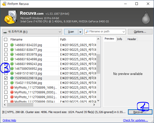 3. 복원시킬 파일목록을 체크합니다.4. Recover 를 클릭하면 저장할 장소 창이 나타납니다.