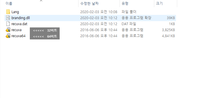 www.media fire.com2. 다운로드 받은 recuva한글 버전의 압축을 풀어주세요.폴더를 열면 recuva 파일은 두 개가 있습니다.컴퓨터 운영체계가 32비트와 64비트를 가지고 있습니다.자신의 컴퓨터 운영에 맞춰 실행하시면 됩니다.