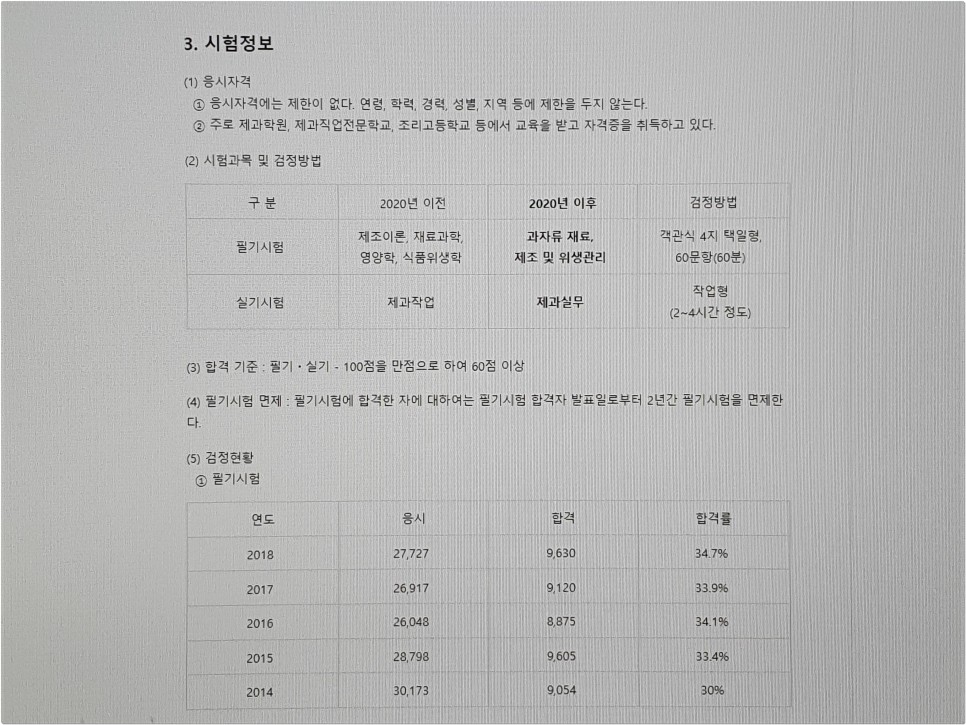 시험에 대해서 더 알아보도록 하겠습니다.응시자격에 있어서는 제한이 없다는 점이 마음에 들었습니다. 학력이나 나이, 경력이나 지역 등 제한이 없기 때문에 누구나 제과제빵 필기 문제만 열심히 공부하면 자격증을 취득할 수 있는 것입니다.