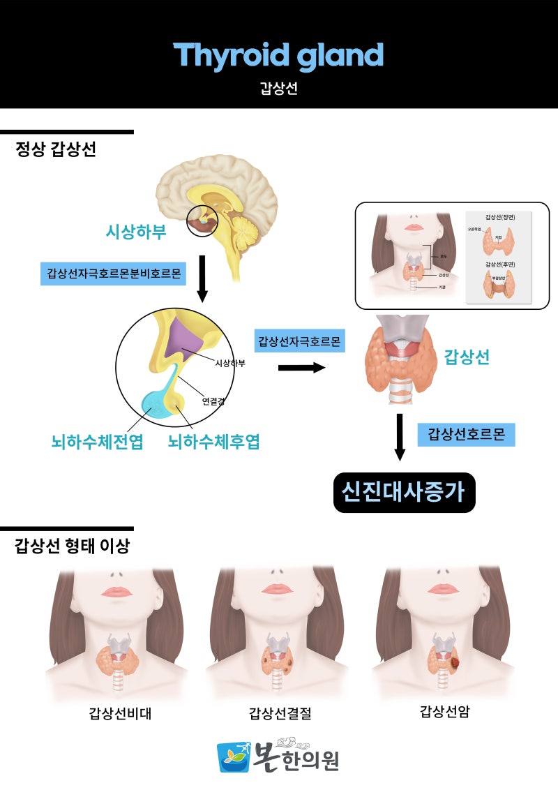 만약에 갑상선 호르몬이 부족하게 되면 ‘갑상선 기능 저하증’이 유발되게 됩니다.갑상선 호르몬이 부족하여 체내 대사 과정이 느려지고 체온 조절에 문제가 생겨 추위를 느끼기 쉽습니다.또한 섭취하는 음식이 늘지 않아도 체중이 늘기 쉽습니다.기타 만성적인 피로감, 소화기능 저하로 변비가 올 수 있으며 심박수 저하, 얼굴 붓기, 손발 저림, 근육 경련 등의 증상이 나타날 수 있습니다.