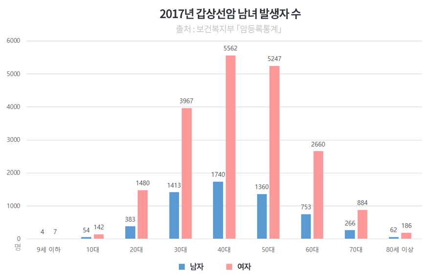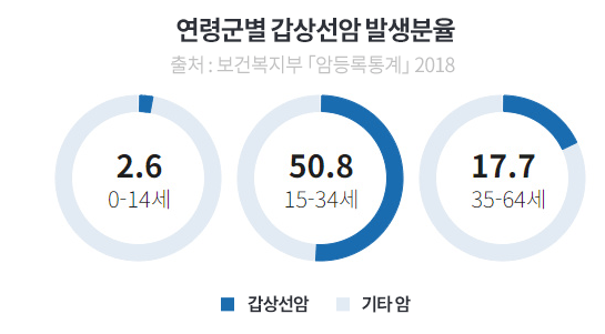 갑상샘암은 여성이 남성보다 34배 정도 많이 발생하고 다른 암에 비해 비교적 3050대와 같은 젊은 나이에 많이 발생한다. 2018년 보건복지부 암등록 통계에 따르면 1534세 남녀 암환자의 50%는 갑상선암일 정도.