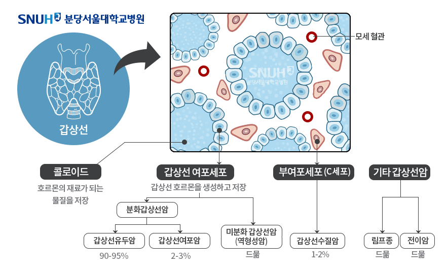 갑상샘암은 크게 분화갑상샘암, 수질암, 역형성암, 기타 암 등으로 나뉜다. 이 가운데 가장 발생빈도가 높은 것이 분화갑상선암인 갑상선유두암. 국내 갑상샘암의 90% 이상을 차지하며 2050대 여성에게서 흔히 발생한다.