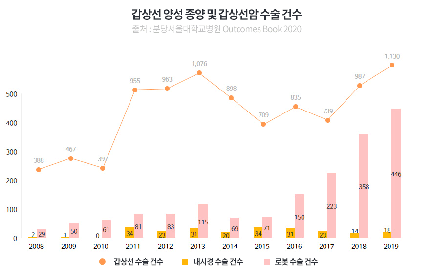 갑상선암 수술방법은 크게 경부절제수술, 내시경수술, 로봇수술로 나뉘는데 점차 로봇수술이 증가하는 추세다.2008년부터 2019년까지 분당서울대학교병원에서 실시한 갑상선 수술 건수를 보면 2016년부터 점차 로봇수술 건수가 오르기 시작하여 2019년에만 약 40%가 로봇수술을 시행하였다.