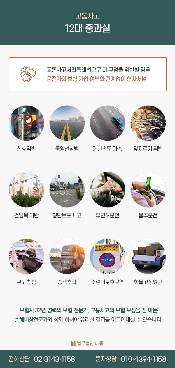 사실 운전이라는 행위는 언제든지 누군가의 생명을 위협하는 행위라고 할 수 있습니다. 그래서 우리는 이러한 사고에 대비해서 자동차 보험에 가입하게 됩니다. 자동차보험에 가입하면, 교통사고가 발생했을 경우, 보험회사가 피해자분에 대한 손해배상 책임을 대신하기 때문에, 가해자에게는 차량의 수리비, 치료비 이외에는 그다지 큰 금전적 피해가 발생하지 않게 됩니다. 하지만 주의해야 할 점은, 12 대 중과실을 일으키거나 교통 사고 사망 피해가 나오거나 한 경우입니다.