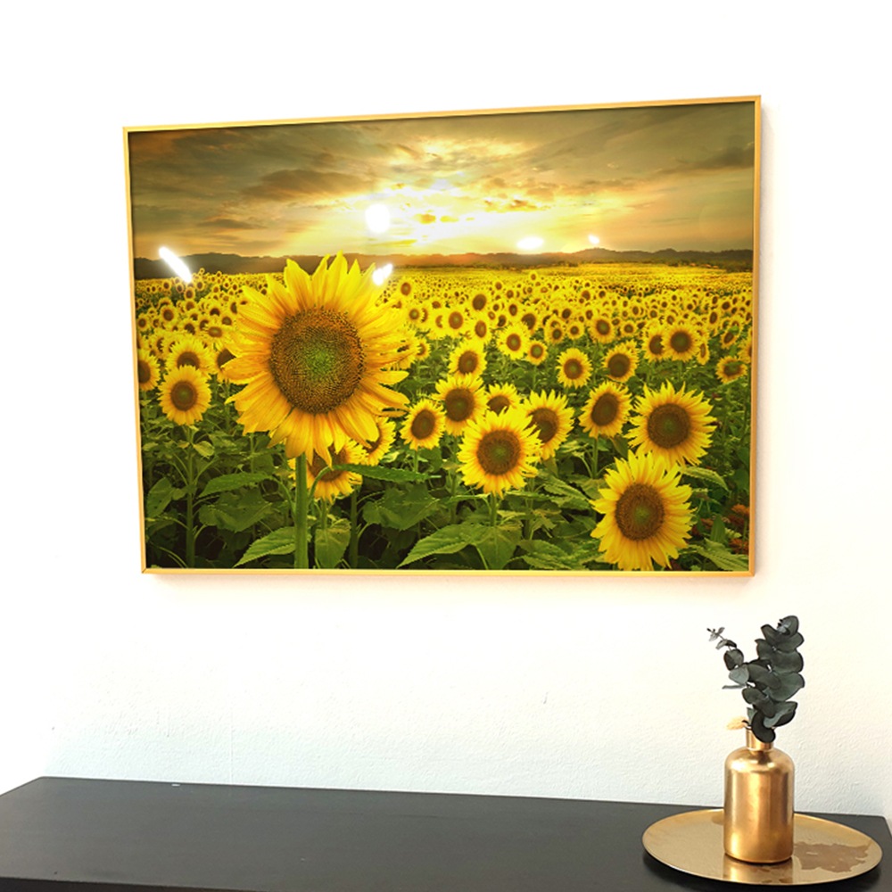 해바라기꽃밭R 풍경화 그림 풍수 인테리어 액자 맑은 하늘에 노란 해바라기꽃밭이 예쁜 풍경화 인테리어 액자입니다.보기만 해도 아늑하고 따뜻한 기분이 느껴지는 것 같아요.금전운과 행운, 복을 가져다주는 그림으로 알려진 노란 해바라기 액자는 풍수 인테리어 소품으로 가장 활용하기 좋습니다.해바라기 그림 액자처럼 풍수에 좋은 그림, 돈이 들어가는 그림은 실내 공간에서도 잘 보이는 위치인 거실 인테리어나 현관 앞에 걸어두면 효과가 더 좋다고 합니다.화려함이 가득한 노란 해바라기 꽃밭 풍경화로 깨끗하고 멋진 실내 인테리어를 연출해보세요.좋은 기운을 가져다주는 해바라기 풍경화 액자이므로 부모님 선물이나 개업, 집들이 선물처럼 특별하고 센스 있는 선물용 액자로 활용할 수 있는 풍수 인테리어 소품입니다.홈 인테리어 액자뿐만 아니라 사무실, 나들이, 매장 등 다양한 상업공간에도 걸치기 좋은 해바라기 그림 액자입니다.