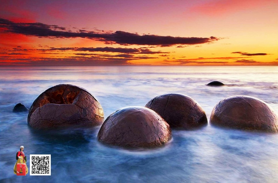 퇴적물과 광물의 신비로운 독특한 바위 군락=뉴질랜드의 코에코해비치는 거대한 둥근 바위들이 해안에 널려 있는 것으로 유명하다. 이 바위는 수백만년에 걸쳐 형성됐으며 퇴적물과 광물이 쌓여 독특한 둥근 모양의 돌이 아름답게 펼쳐져 군락을 이루고 있다.
