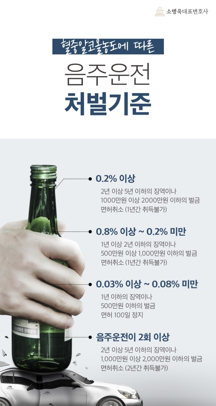 0.08~0.02% 미만이면 1년 이상~2년 이하의 징역형 또는 500만원 이상~1000만원 이하의 벌금형으로 처벌됩니다.