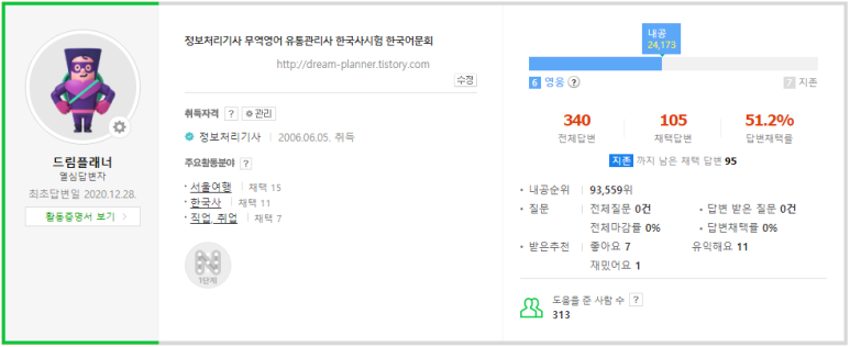 안녕하세요? 아이들과 나들이 혹은 여행경험을 공유하는 나들이 플래너입니다. 저는 드림플래너라는 이름으로 티스토리에서 “꿈을 찾는 블로그”라는 블로그도 운영하고 있습니다. 『꿈을 찾는 블로그』에서는 독서를 통해 꿈을 찾고 꿈을 실현하기 위해 자기 계발을 하고, 자기 계발을 통해 꿈을 이루는 과정에 대해 이야기하고 있습니다. 네이버 지식인을 통해 서울여행코스, 자격증 취득, 연봉 협상 팁 등의 질문에 답변해 주셨는데 이미 영웅 등급입니다.^^