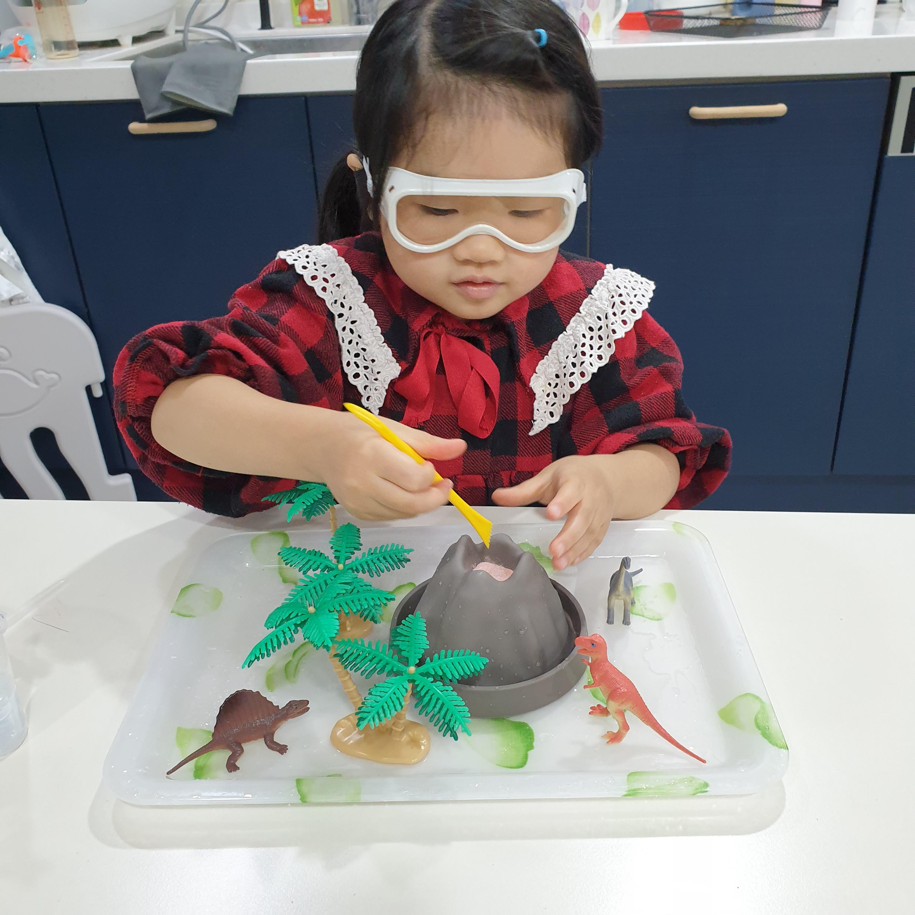 이 놀이에서 화산 폭발이 차지하는 시간의 비율은 매우 짧다. 화산을 만드는 과정에서 더 즐거움을 느껴보면 좋을 것 같아. 의미도 부여하고 스토리텔링도 하고 이곳에서 공룡들이 평화롭게 살았는데 갑자기 땅이 흔들리고 붉은 용암이 쏟아져나와 공룡들은 도망쳐서 난리가 났습니다. 같은