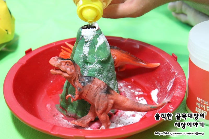 그레이트북스 과학 공룡 책에서 본 화산 폭발 실험을 실행에 옮기기로 한다.검색해보니까 이제 엄마표 놀이 입문 단계 같은 놀이.