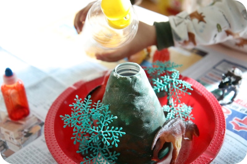 그레이트북스 과학 공룡 책에서 본 화산 폭발 실험을 실행에 옮기기로 한다.검색해보니까 이제 엄마표 놀이 입문 단계 같은 놀이.