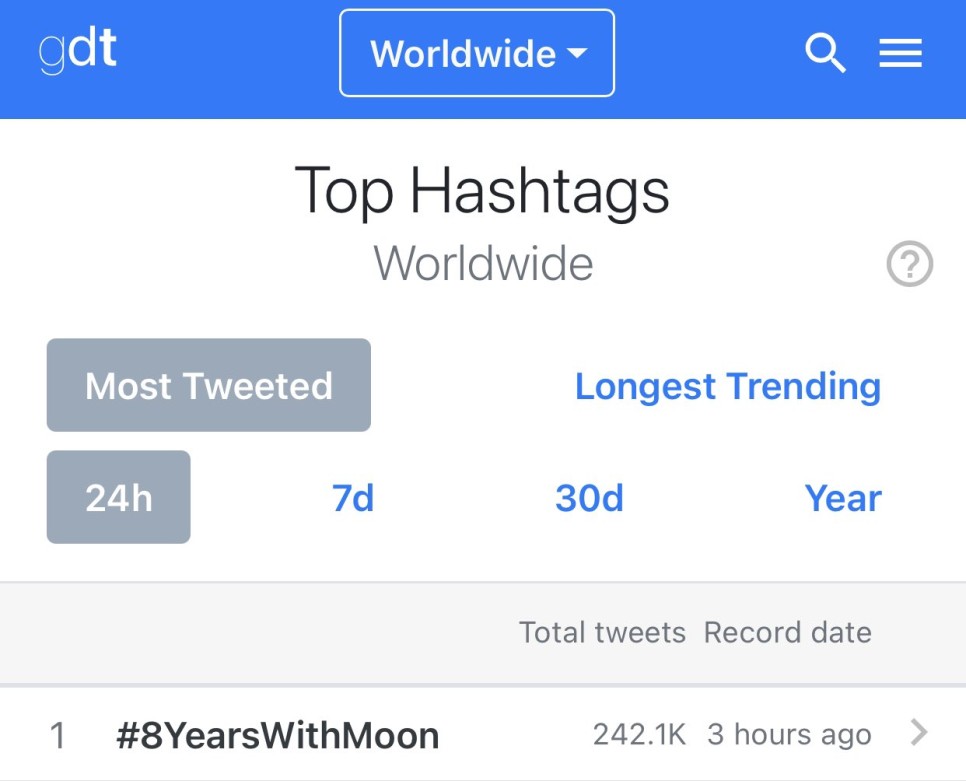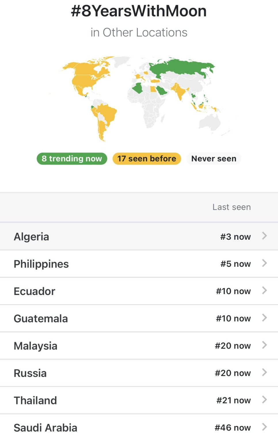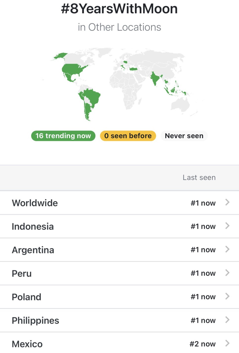 Few hours ago, #8YearsWi thMoon was still trending in 8 COUNTRIES and trended in a total of 24 COUNTRIES overall.It is also the #1 most tweeted hashtag in the past 24 hours!