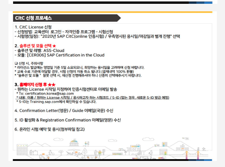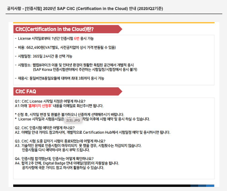 SAP CitC 자격증 절차는 다음과 같다(SAP 코리아에서 발췌). 응시비용은 꽤 비싸지만 6회의 응시기회는 취득할 수 있는 좋은 기회가 될 것 같다.
