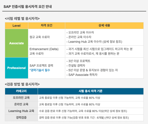 SAP는 처음부터 자격을 취득할 자격을 부여하지 않는다. SAP 온라인 교육, 오프라인 교육, Learnightub 교육을 듣거나 경력 증명을 인정받아야 한다. 러닝허브는 온라인 녹화강의와 비슷하다고 보면 된다. 러닝허브는 유효기간이 1년이므로 유효기간 내에 자격증 시험을 치러야 한다. 또한 한국에 거주하는 지원자는 SAP Education Korea에 자격 검증을 받아야 하므로 아래 사이트에서 인증시험 규정을 안내하도록 하자.